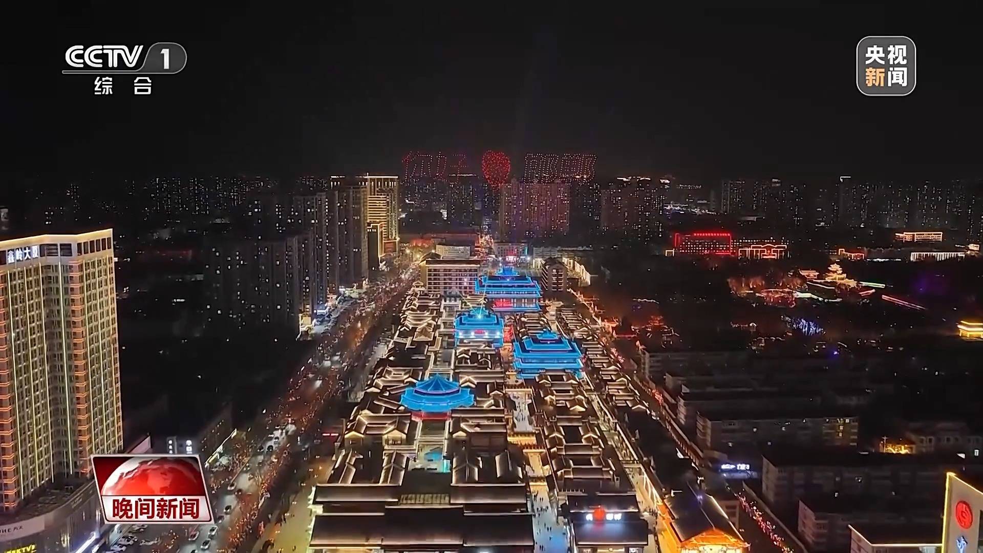 在河北邯郸,全长1.8公里的邯郸道历史文化街区灯火璀璨,古风灯笼错落摇曳,特色成语灯帘相映成趣,浓郁的节日喜庆氛围扑面而来。夜幕降临,数百架无人机腾空而起,以夜空为画布,精准勾勒出和氏璧、邯郸古建轮廓等城市标志性符号,光影交织间,游客们沉浸其中,感受到节日的热闹与文化的厚重。